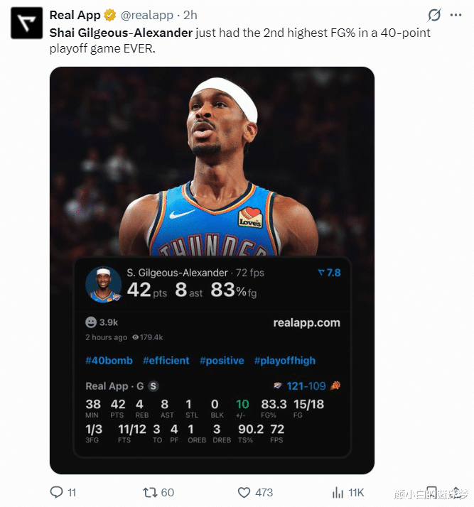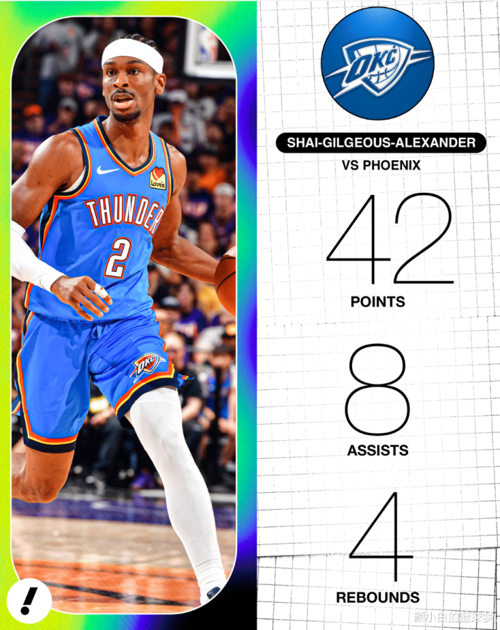 这场比赛亚历山大创造多项记录:1.SGA季后赛单场42分刷新新高;